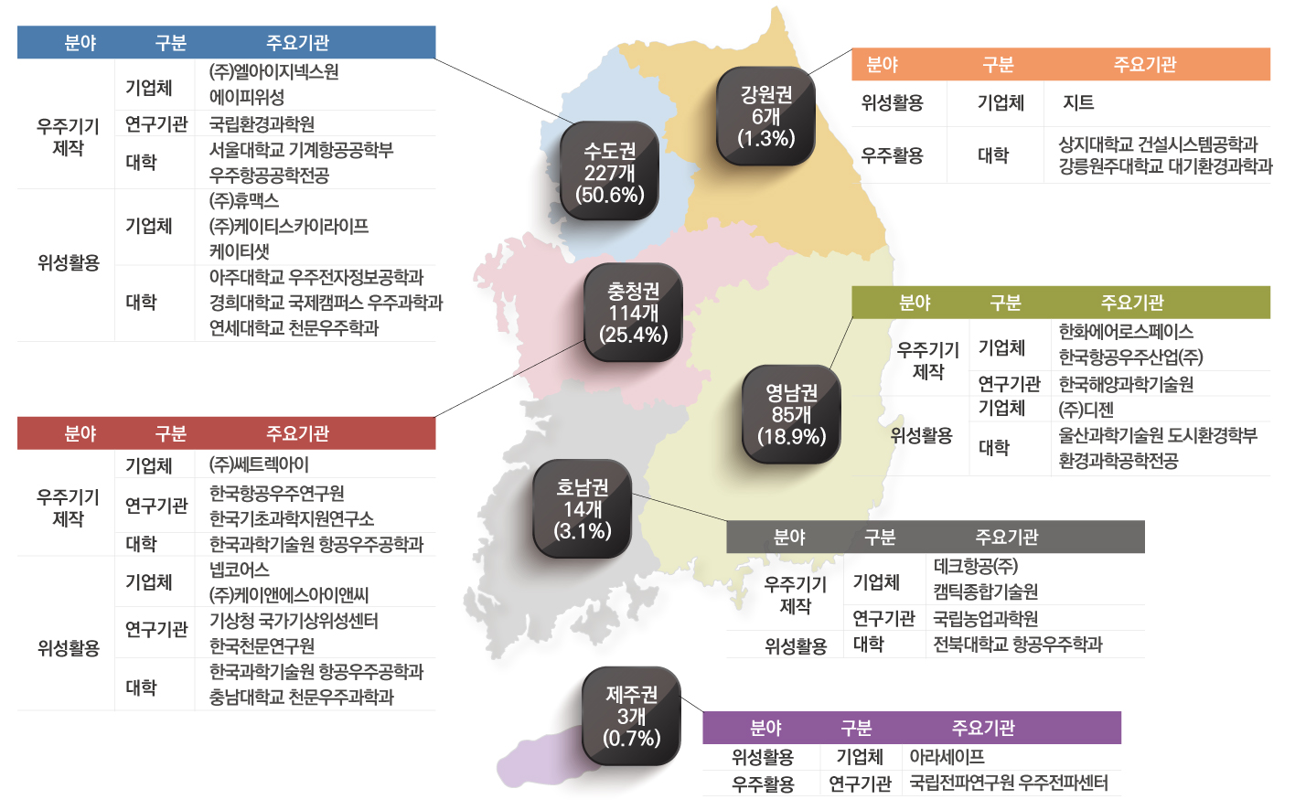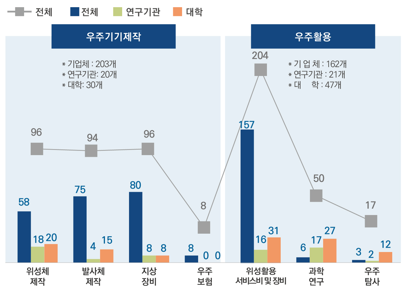 연구기관·대학 : 과학연구 분야 및 위성활용 분야 등 우주분야 전영역에 걸쳐 고루 참여 중