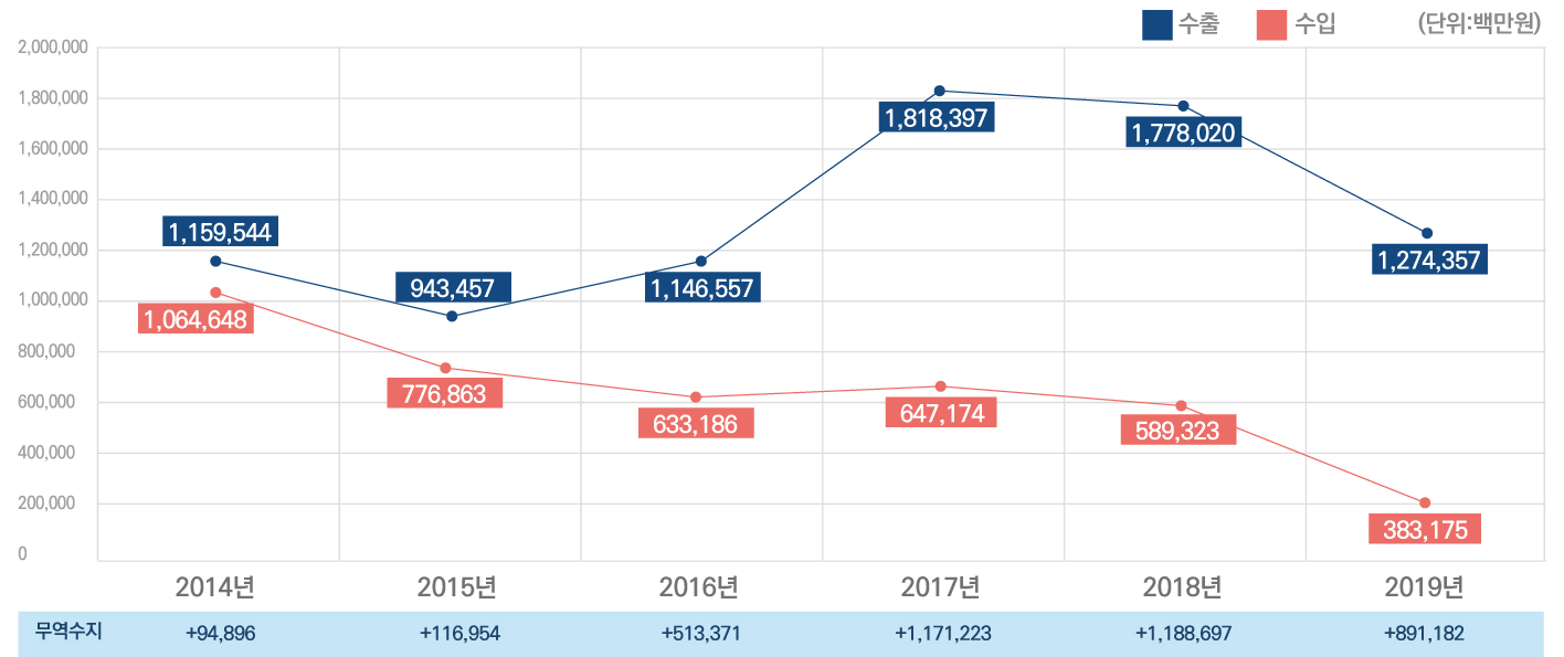 무역수지는 2013년 이후로 지속적으로 흑자를 기록하고 있지만, 2019년에는 전년대비 감소